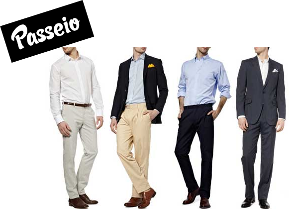 Passeio completo - (Recepção, coquetel, alto esporte, habillè, social completo ou social), São trajes mais formais, ideais para jantares, coquetéis, óperas, casamentos. Ou seja, para festas finas.